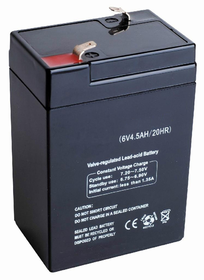 Аккумулятор свинцово-кислотный 6V 4.5АH имеет регулируемый клапан, благодаря этому прост в эксплуатации и обслуживании. Имеет достаточно большой срок службы - от 3х до 5ти лет. Одного рабочего цикла хватает на длительный период работы, циклов перезарядки можно проводить не менее 1000. Температурный рабочий диапазон от -20оС до +50оС.Габариты ДхШхВ, мм: 70*47*100 (106 с клеммами)