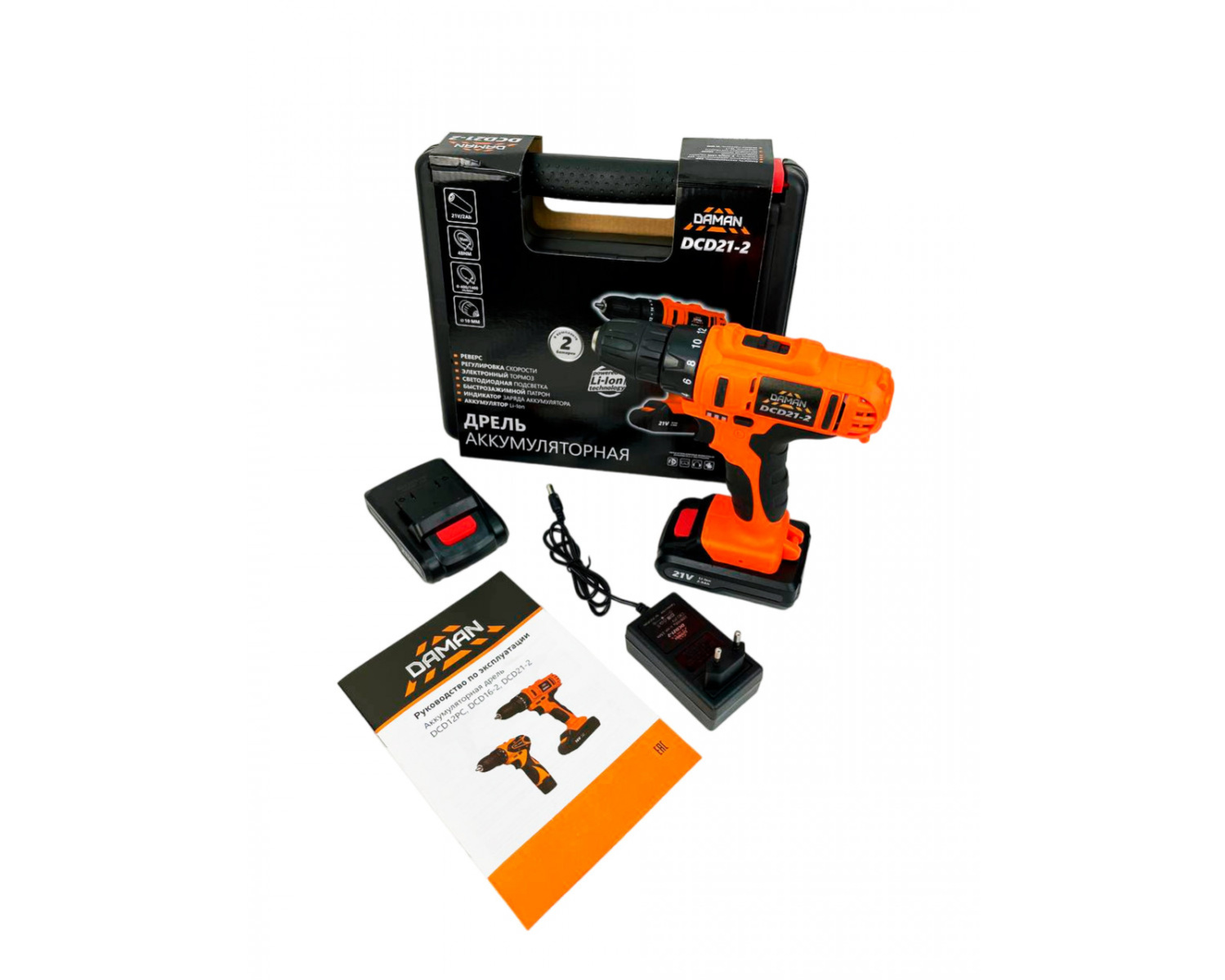 Дрель аккумуляторная DAMAN DCD21B-2 (2ак, 10мм, 2,0Ач, кейс, набор)