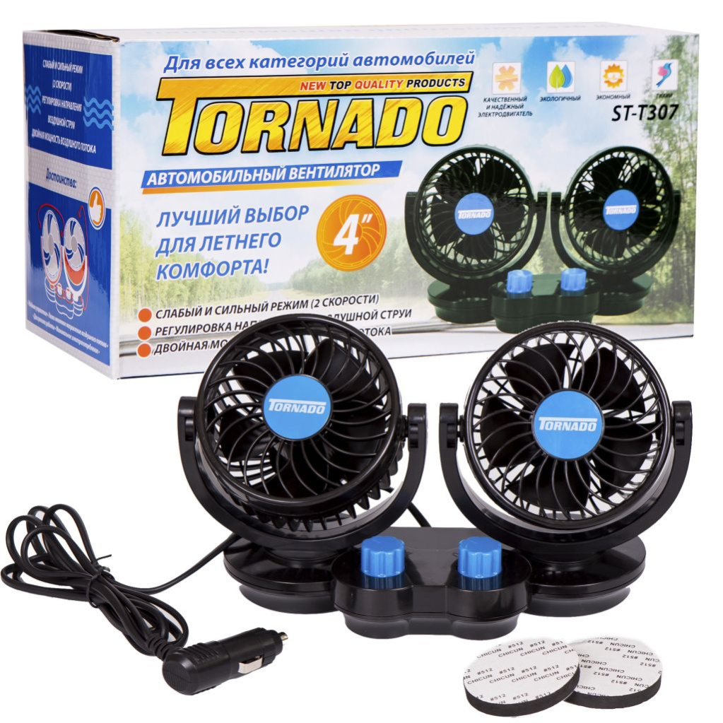 Вентилятор автомобильный TREK Т-307 12V, 4", 6.5 Вт (на скотче) двойной с раздел.регулировкой