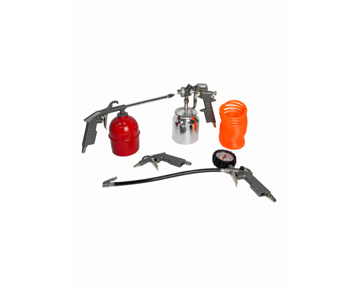 Набор пневмоинструмента для воздушного компрессора (с нижним баком) — набор из 5 предметов. Подходит для покрасочных работ, нанесения антикоррозионного покрытия, продувки деталей от пыли и подкачки шин.Комплектация: краскопульт с нижним бачком, краскопульт для вязких жидкостей, пистолет для продувки, пистолет для подкачки шин, витой шланг.