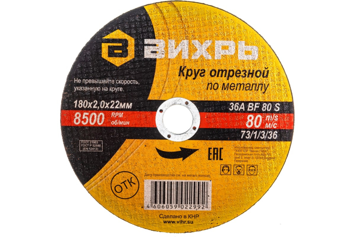 Диск отрезной по металлу ВИХРЬ 180*2,0*22