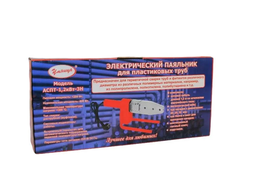 Сварочный аппарат мощностью 1200Вт для пластиковых труб позволит Вам легко и быстро сварить враструб трубы и фитинги любых диаметров! Предназначены для сварки труб и фитингов из различных полимерных материалов, например, из полипропилена, полиэтилена, полибутадиена и дрНасадки 20, 25, 32, 40, 50, 63 мм.Комплектация: Ножницы для резки трубы, подставка, рулетка, уровень, перчатки, отверька, кейс.Напряжение, В 220.Температурный диапазон работы, °C 50-300 .Встроенный термостат, для автоматического поддержания заданной температуры нагрева.В комплекте: сетевой кабель длиной 1,2 метра со штепселем европейского типа; металлический кейс; три насадки диаметрами 20 мм, 25 мм и 32 мм, 40 мм, 50 мм, 63 мм.; три болта и винт для крепления насадок; шестигранный гаечный ключ; подставка.