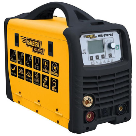 KAISER MIG-310 PRO — многофункциональный профессиональный сварочный полуавтомат, предназначен для сварки в режимах MIG/MAG/TIG, а так же в режиме MMA на постоянном токе. Не подходит для сварки алюминия. Питается от низкого напряжения (от 180 В), есть защита от перегрева, параметры выводятся на электронный дисплей и устанавливаются с помощью вспомогательных кнопок. Быстрая заправка проволоки, механизм подачи полностью механический.Характеристики